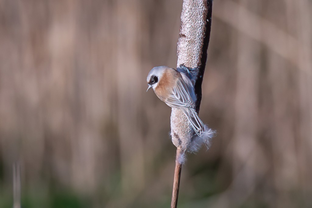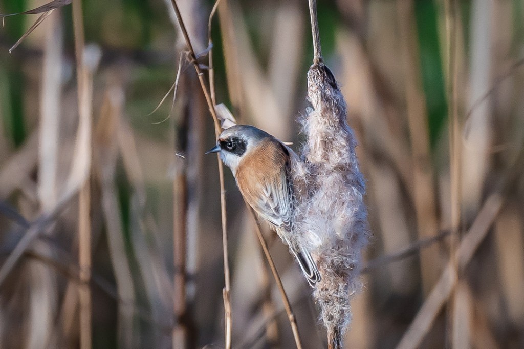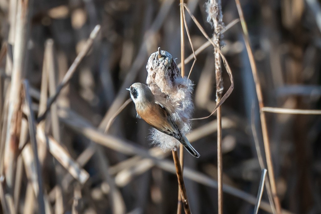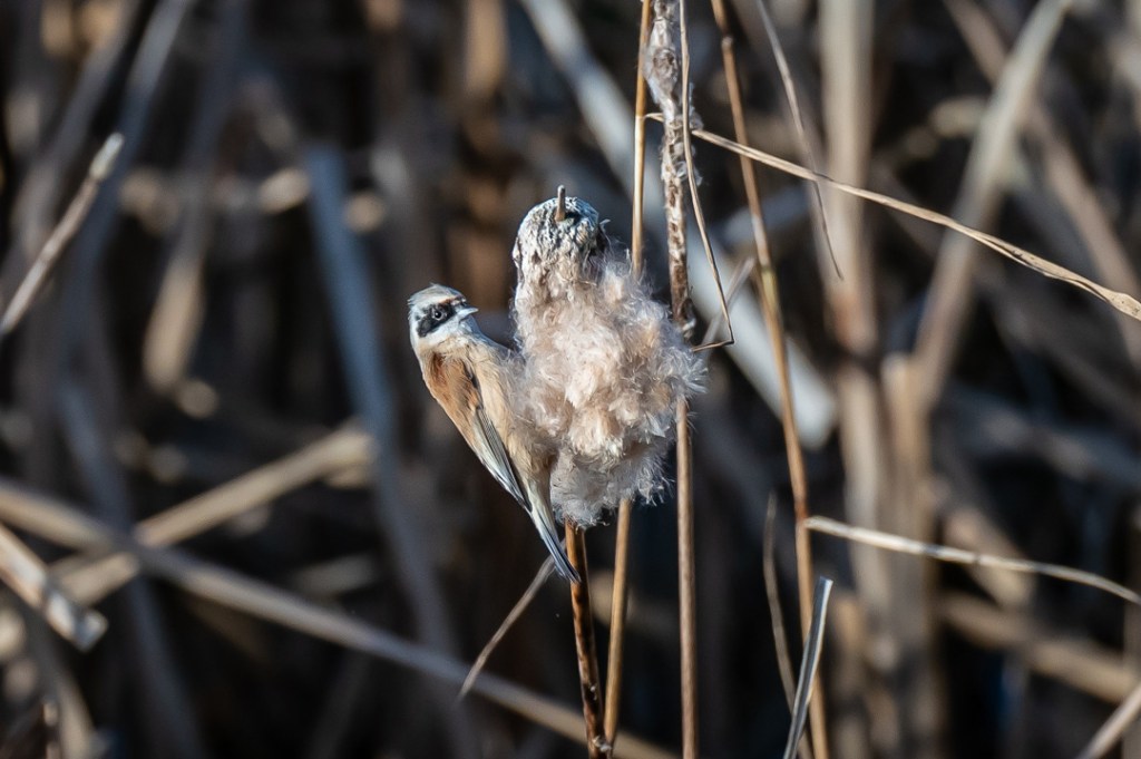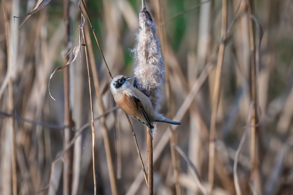 I was hoping to see the penduline tits which I have never seen and which had been reported here recently. There was a fresh breeze and it was very cold but I was encouraged by the excellent light. However, for the first hour I only saw reed buntings and stonechats. My patience was well rewarded , however, when two penduline tits appeared and stayed around feeding on the bull rushes until I felt I could take no more photos.