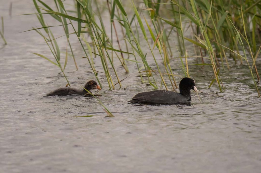 Today I saw swifts here for the first time this year. There were more sightings of hobbies. Marsh harriers, great egrets and grey herons made regular appearances. However, the real treat was to see 2 great crested grebe chicks and two coot chicks too.